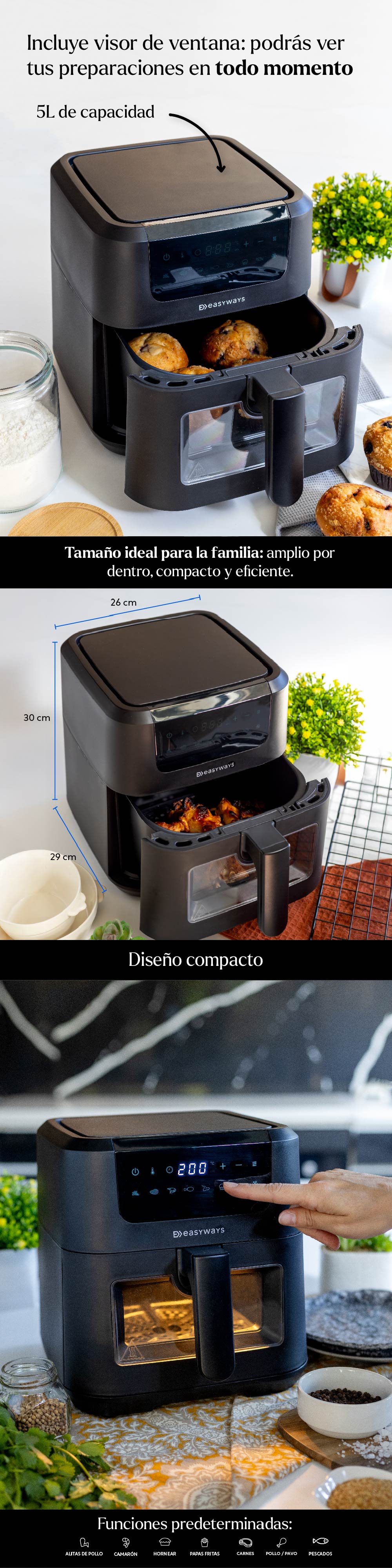 La AirFryer Chic Prime de EasyWays es la solución perfecta para quienes buscan una freidora de aire que combine estilo y funcionalidad. Con su diseño elegante en negro mate y un visor de ventana que permite monitorear las preparaciones sin abrir el cajón, podrás cocinar de manera práctica y eficiente.