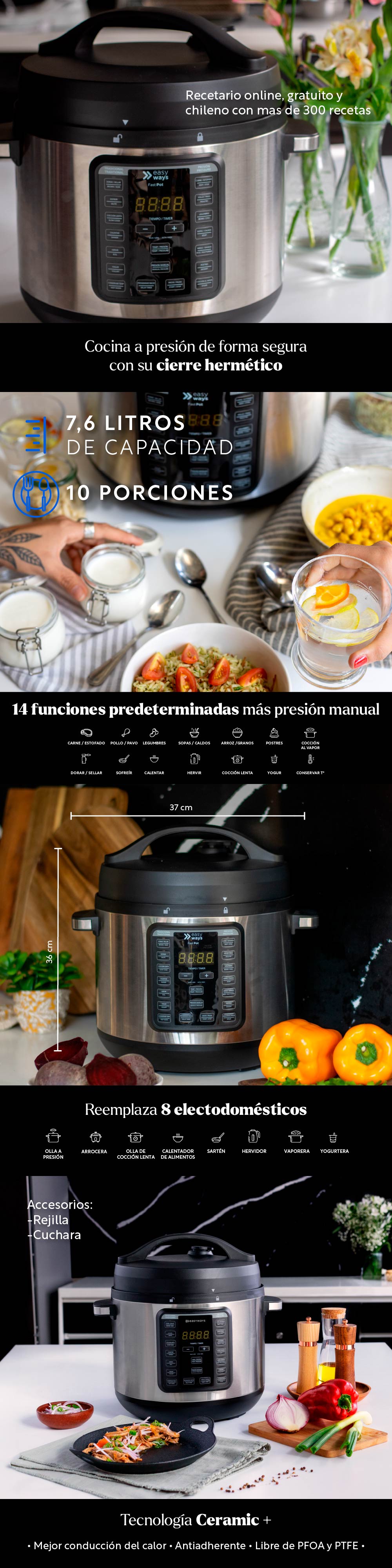 Dorar/Sellar - Sofreír - Fuego Bajo - Hervir - Carne/Estofado - Pollo/Pavo - Legumbres - Sopas/Caldos - Arroz/Granos - Postres - Yogur - Conservar Temperatura - Presión Manual