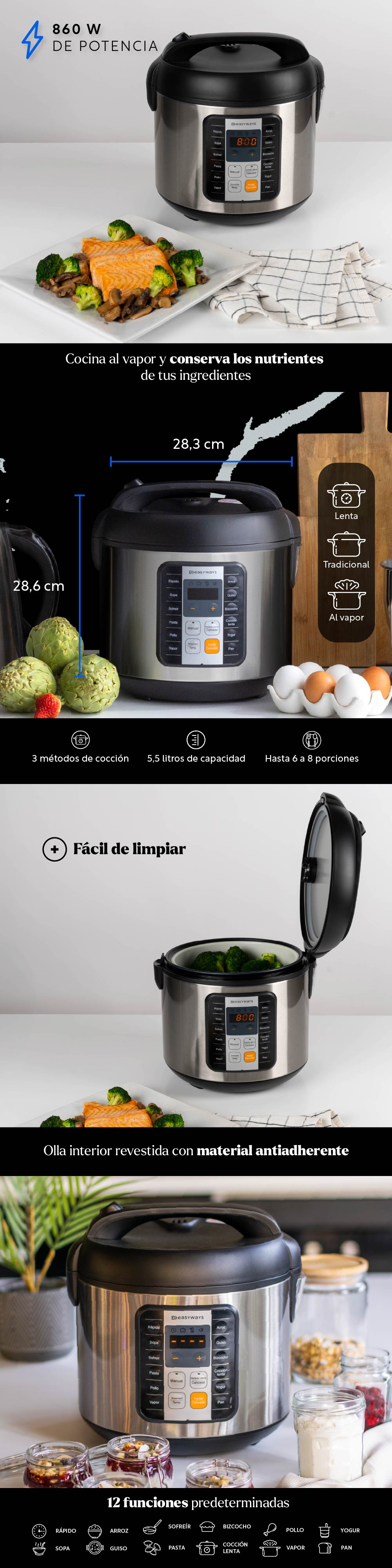 ¡Descubre la MultiCooker Pro de EasyWays! Esta olla multifuncional es la solución perfecta para hacer tu cocina más eficiente y disfrutar de una amplia variedad de recetas sin complicaciones. Con una capacidad de 5.5 litros, es ideal para preparar comidas para hasta 8 personas.